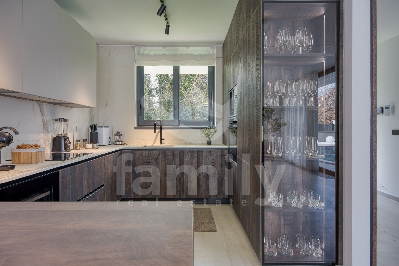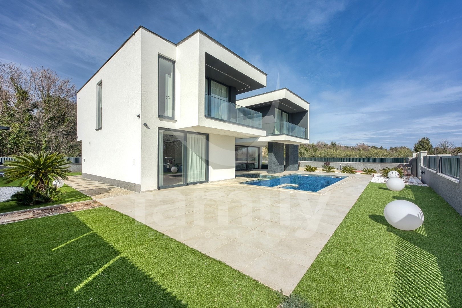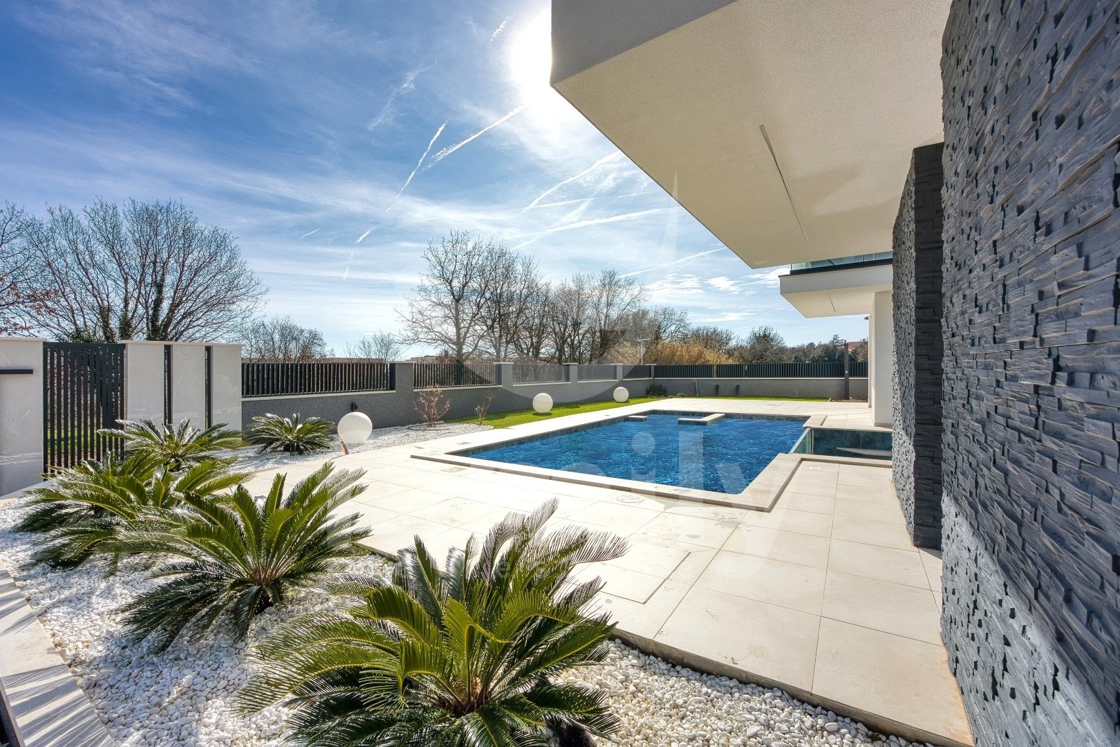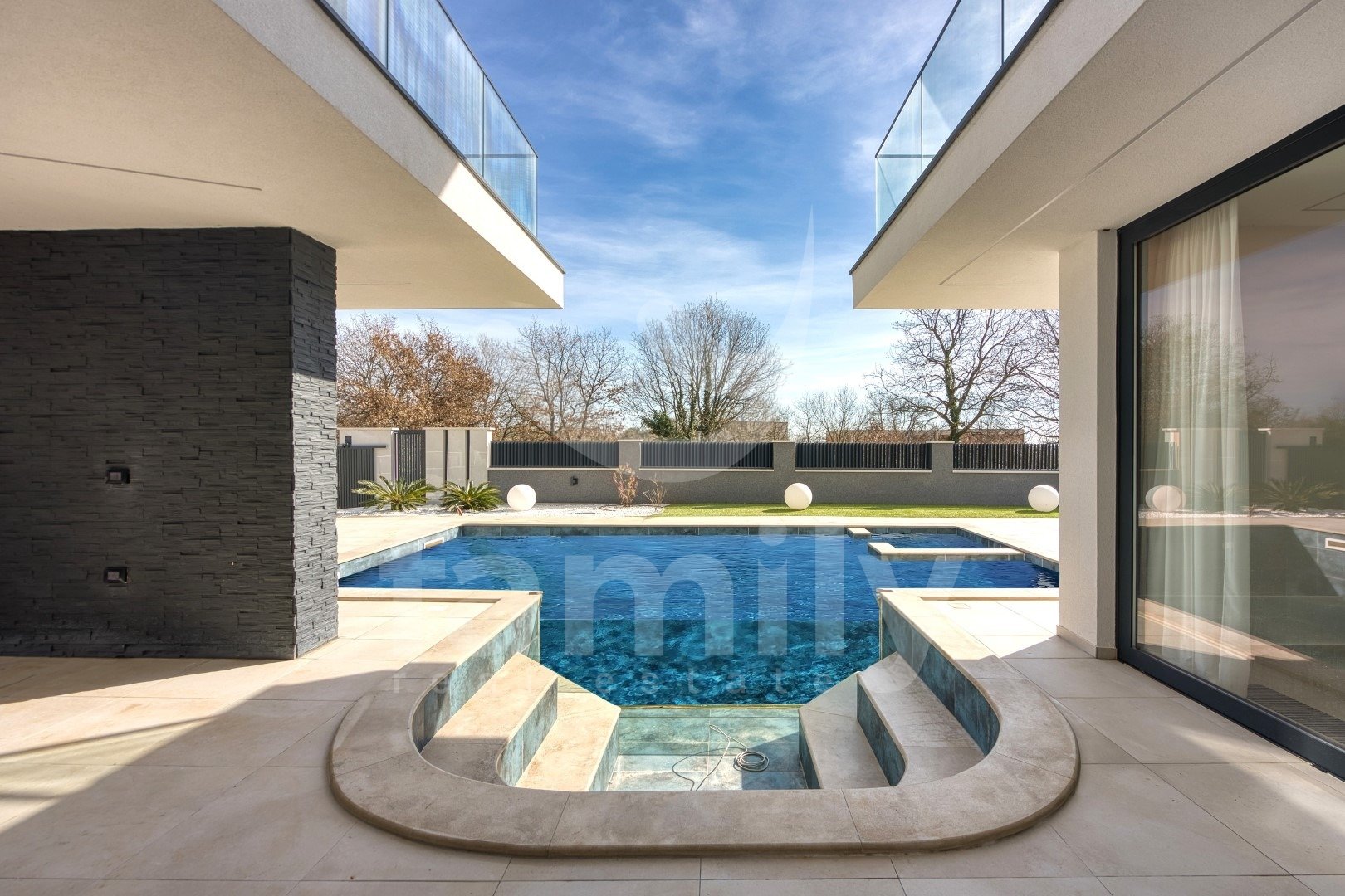 DVORIŠČE: ogrevan bazen z masažo + paviljon pod nivojem bazena s pogledom na 3 m dolg stekleni bazen + prostor za sončenje + zasebno parkirišče s polnilnico za električne avtomobile