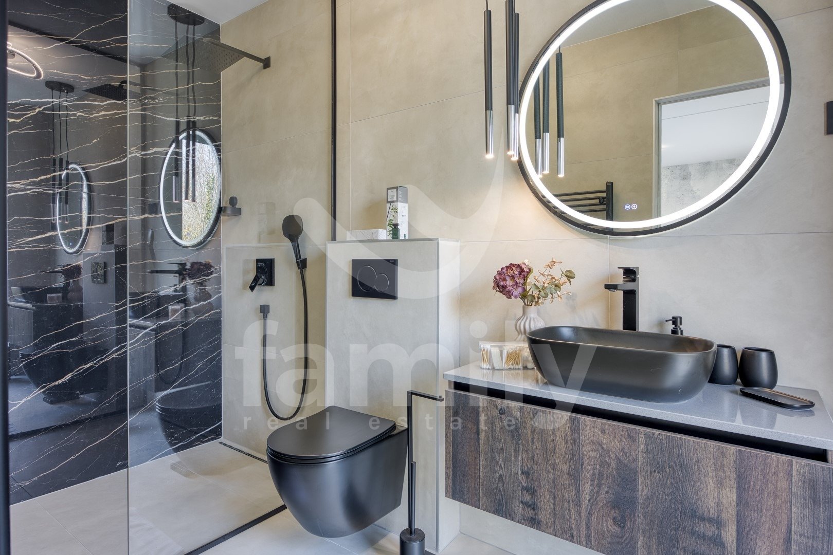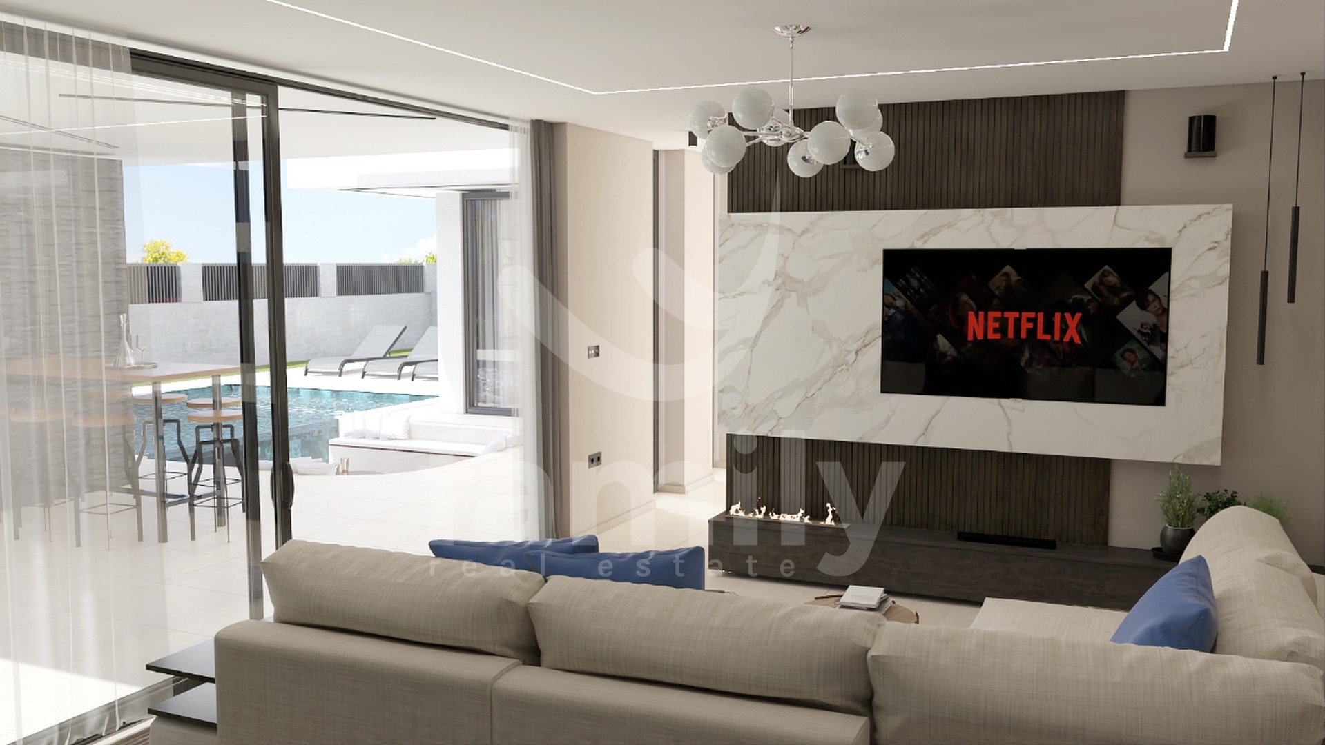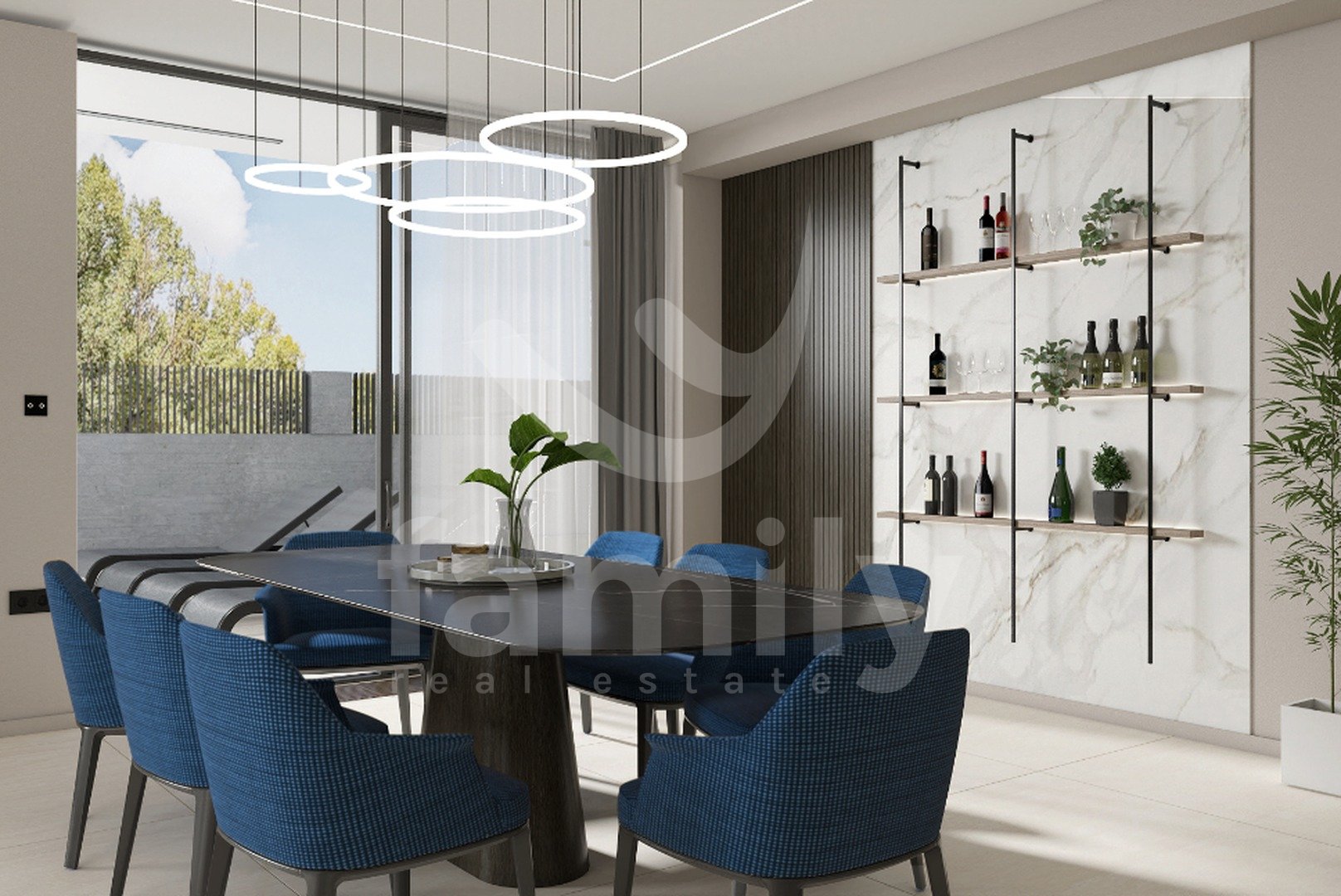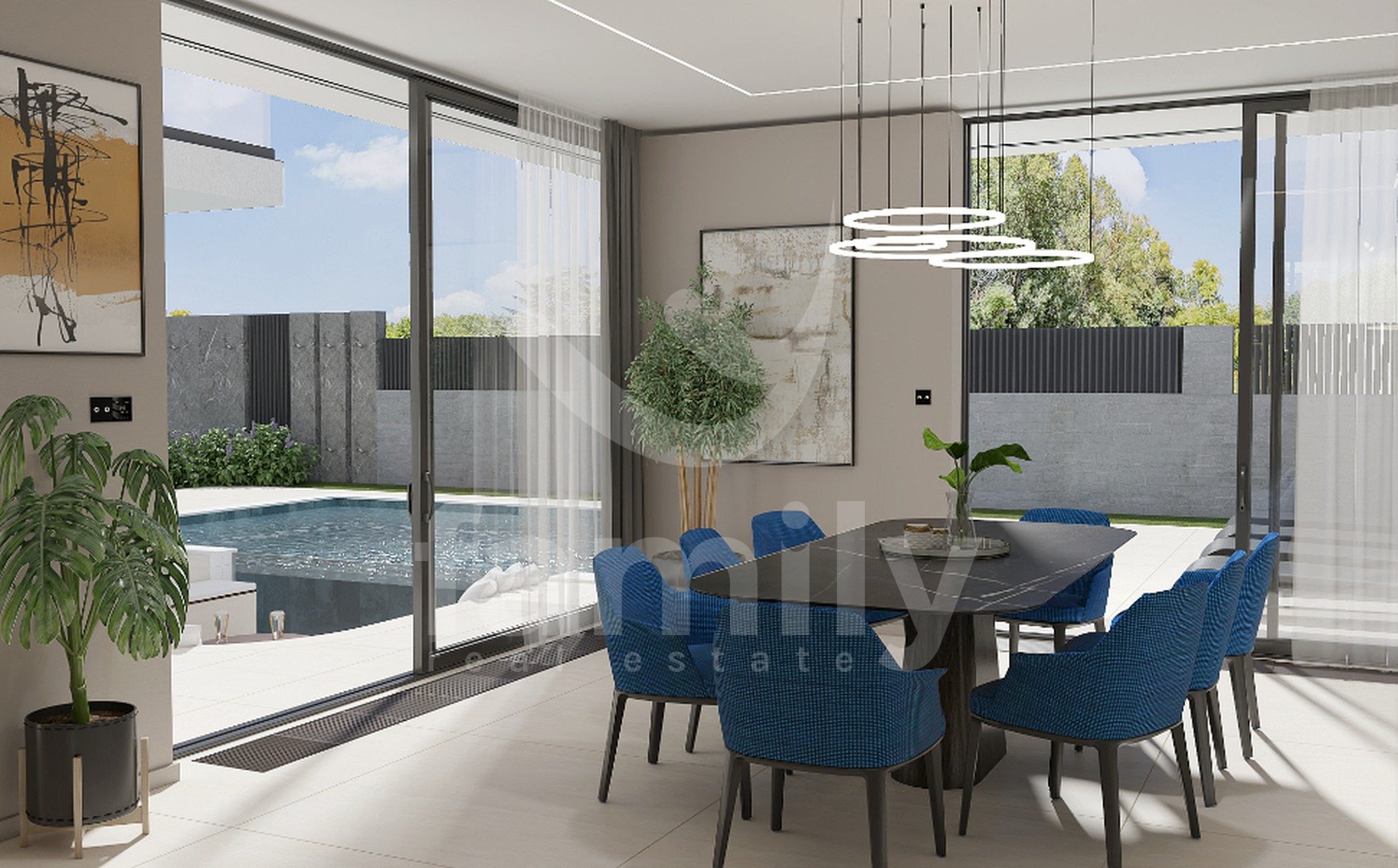 DVORIŠČE: ogrevan bazen z masažo + paviljon pod nivojem bazena s pogledom na 3 m dolg stekleni bazen + prostor za sončenje + zasebno parkirišče s polnilnico za električne avtomobile